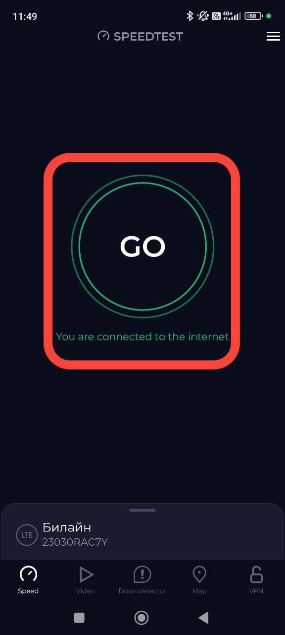 2. В центре появится круглая кнопка “Начать”(“GO”). После ее нажатия запустится тест скорости.